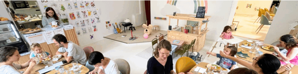 - une aire de jeux adaptée et cosy de 100m², disposant de jeux pensés pour les enfants entre 0 et 5 ans (imitation, musique, motricité…) et d’un salon de thé, pour le plaisir des adultes accompagnants